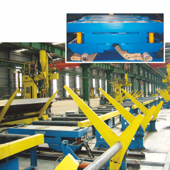 移鋼機 H型鋼組立完畢后,兩臺移鋼機抬起工件送至60°翻轉(zhuǎn)支架上翻轉(zhuǎn)并焊接。